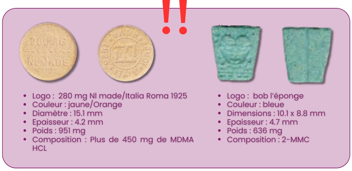 Deux comprimés potentiellement dangereux pour la santé ont été identifiés en Belgique grâce au service de testing de l’asbl Modus Vivendi (TRIP). Ces produits ont été achetés à Bruxelles. Le premier contient une concentration en MDMA particulièrement élevée et dangereuse. Le deuxième ne contient pas de MDMA mais de la 2-MMC.
